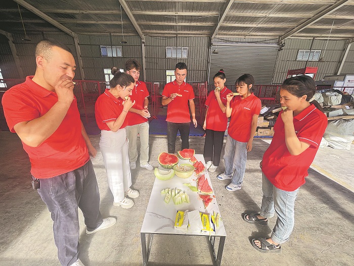 6月13日,新疆喀什地区莎车县发布高温橙色预警。在当地某快递网点配送中心,快递员们正在吃网点提供的瓜果降温,随后将继续踏上进村送快递之路。据快递员反映,每天的进村快递都能在当天下午5点前送到各村的邮政快递服务站。本报记者 甘皙 摄