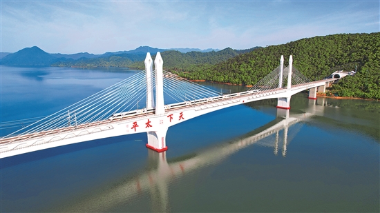6月15日,超级“环线”列车通过位于安徽省黄山市的太平湖特大桥。