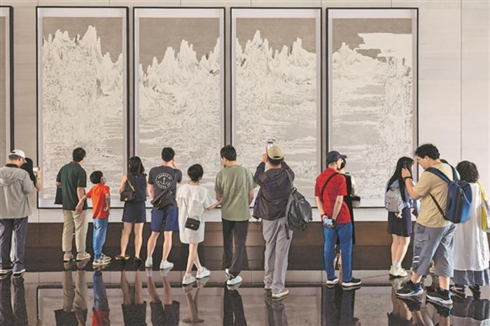 6月16日,市民在上海世界会客厅内欣赏艺术作品。当日,位于上海虹口北外滩的世界会客厅迎来首个公众开放日。世界会客厅原址是拥有百年历史的扬子江码头,今年7月起将在每月最后一周的周六向公众开放。新华社记者 王翔 摄
