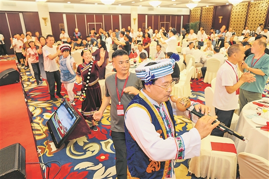 6月16日,来自云南的劳模工匠代表们在联欢晚会上载歌载舞送祝福。