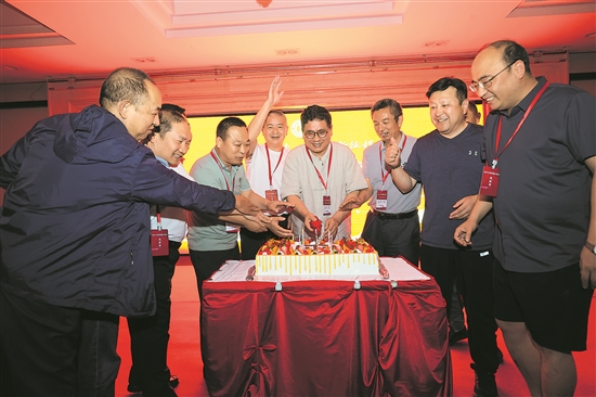 6月16日晚,在全总国际交流中心举行的联欢晚会上,主办方为近期过生日的劳模工匠代表们送上生日蛋糕,表达祝福。当天正好过60周岁生日的全国劳模潘建乔(右四)为大家切蛋糕。