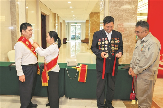 6月13日,2024年全国劳模疗休养启动仪式开始前,全国劳模郭晋龙(右二)向全国劳模张黎明(右一)介绍自己佩戴的奖章。