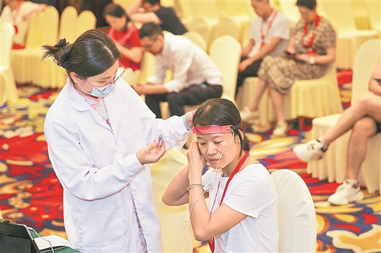 6月15日,在全总国际交流中心举办的脑状态检查及康复指导项目上,工作人员为大国工匠田得梅戴上脑电波检测装置。