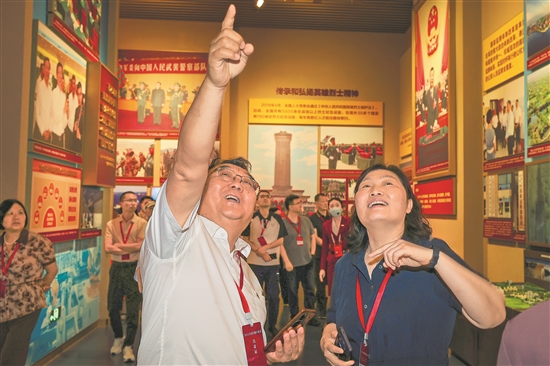 6月12日,首批参加疗休养的200多名劳模工匠代表参观中国共产党历史展览馆。曾获得“改革先锋”称号的全国劳模张黎明(图左)在展览中看到展出的“庆祝改革开放40周年大会”合影照片后,向同行的全国劳模刘丽介绍照片背后的故事。