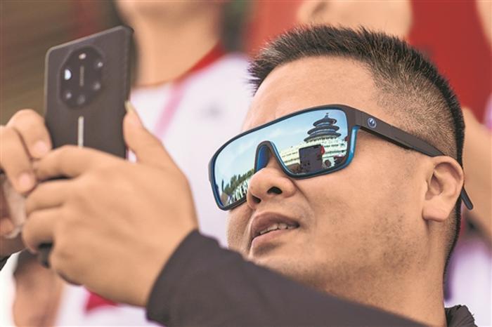 6月14日,劳模工匠代表游览天坛公园祈年殿时,全国抗震救灾模范周选慈拍照留念。