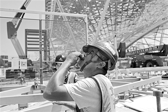 6月12日,在北京城市副中心站综合交通枢纽工程施工现场,北京城建集团的施工人员在饮用藿香正气水解暑。连日来,北方高温天气持续。为了确保工程建设稳步推进,建设施工方通过调整户外施工人员作业时间,发放防暑药品、饮品等方式保障户外施工人员的健康安全。新华社记者 鞠焕宗 摄