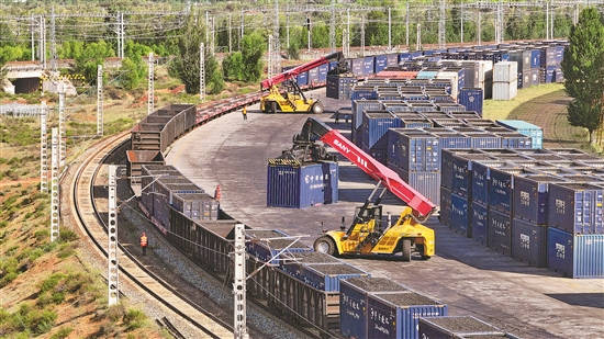 6月19日,机械设备在内蒙古鄂尔多斯市鑫聚源物流园区吊装载有兰炭的集装箱。