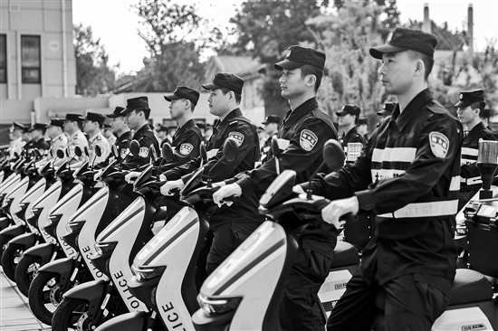 6月13日,北京市公安局东城分局举行了分局机动巡逻队成立暨警用电动车发放仪式。新成立的机动巡逻队每期由5名青年民警和40名战训保安员组成,开展巡逻防控、人流疏导、乱象清整、快速处置等工作。本报记者 蔚可任 摄