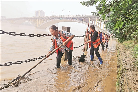 6月19日,在广西柳州市融安县,工作人员在融江边清理淤泥。