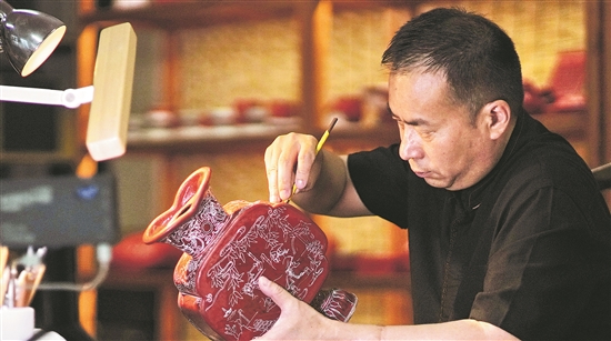 2017年,朱江与廊坊师范美术学院的师生成立工作坊,共同创作了青瓷雕漆茶具、婚庆饰品、现代潮玩摆件和装饰艺术品等雕漆作品,让人们看到了非遗的新面孔,做到了创新性发展和创造性转化,并吸引了许多年轻人关注雕漆文化。近年来,朱江设计和雕刻的作品获得国内外30余个奖项。新华社记者 李欣 摄