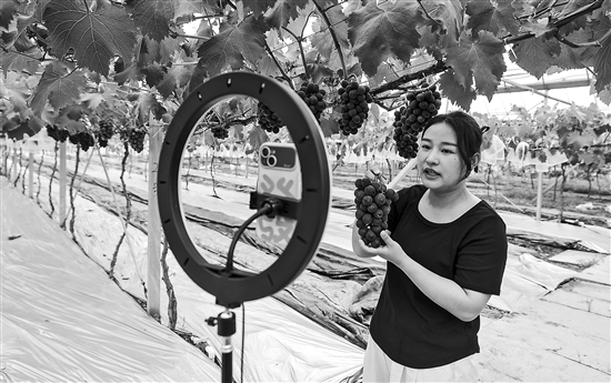 6月19日,一位创业者在葡萄大棚里直播销售葡萄。近年来,浙江省嘉兴市南湖区坚持以人才振兴助力乡村振兴,出台一系列政策措施,包括成立农创客发展联合会、组织乡村CEO培育培训班等,支持“新农人”返乡创业,推动“新农人”抱团发展。“新农人”运用新技术推动了农业现代化发展,也为乡村振兴注入新动能和新活力。