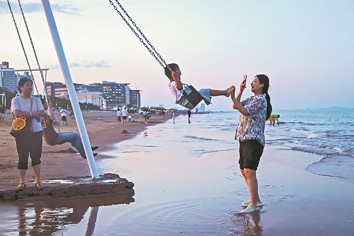 近日,河北省秦皇岛市阿那亚社区,游客们在海边游玩。