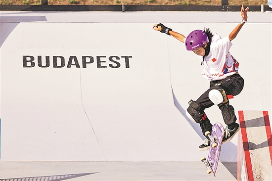 近日,巴黎奥运会资格系列赛布达佩斯站收官,中国队在攀岩、滑板、霹雳舞和自由式小轮车项目中收获12个奥运资格。图为中国选手崔宸曦在滑板决赛比赛中。新华社发(弗尔季·奥蒂洛摄)