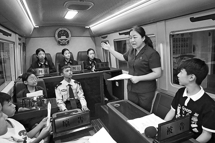 6月24日,在广西柳州市融水苗族自治县融水镇古鼎村小学,模拟法庭正在“审案”。学生穿上制服化身“审判长”“审判员”“书记员”“法警”等,按照法律程序模拟审理一起“校园欺凌案”,并向全校直播实况,让师生在沉浸式体验中了解法律知识、增强法治观念。
