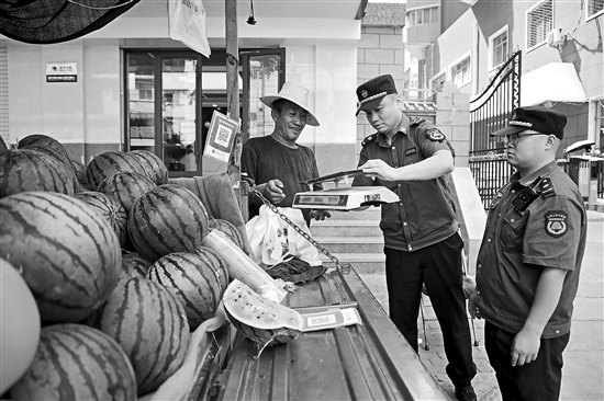 6月26日,在甘肃兰州市七里河区西北中学巷道,城管执法队员在瓜果摊点巡查。入夏以来,兰州市在主城区范围规划设置360处2293个应季瓜果临时摊点,兰州市户籍的瓜农办理“应季自产自销瓜果临时摊点证”后,可在指定点位销售瓜果。