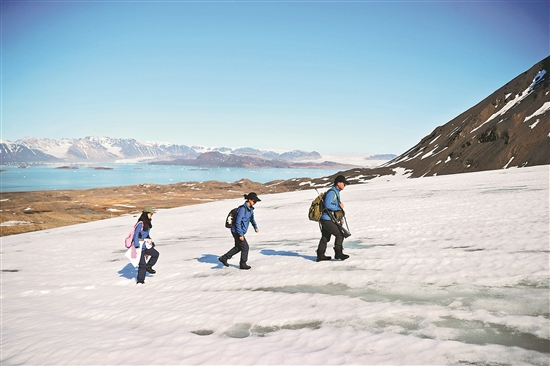近日,在挪威斯瓦尔巴群岛,科考队员徒步前往东洛文冰川采样点。中国科考人员以北极黄河站为基地,对斯瓦尔巴群岛新奥勒松地区两座冰川开展冰川物质平衡、冰川运动、冰川气象、冰川温度、冰-气界面监测等,揭示黄河站冰川退缩的速度及其对全球变暖的响应,为预测未来海平面上升和气候模式的影响提供重要依据。尤其是对北极快速变暖的观测、监测,有助于更准确地预测全球气候变化趋势。新华社记者 赵丁喆 摄