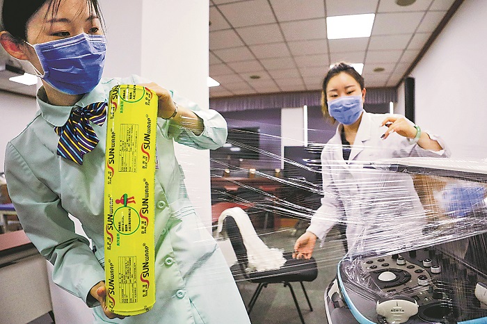 6月23日,北京市朝阳区,中国邮政美猴王分局,完成当日体检的护士正在打包收拾医疗器械。