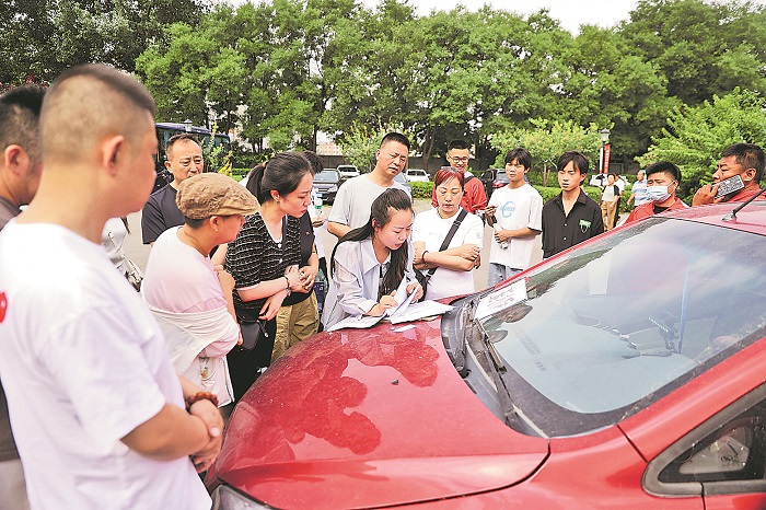 6月27日,北京市通州区宋庄成人教育学校,玉桥街道总工会的工作人员为当日体检的新就业形态劳动者分发体检表。