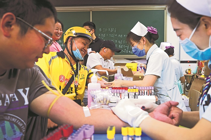 6月24日,北京市通州区宋庄成人教育学校,参加体检的新就业形态劳动者在抽血。