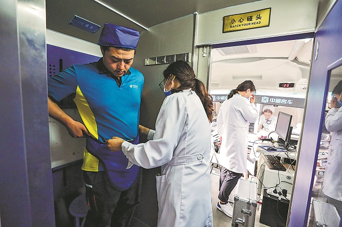 6月22日,北京市朝阳区,中国邮政美猴王分局,移动体检车内,放射科医生帮助一名邮政快递员穿铅衣。