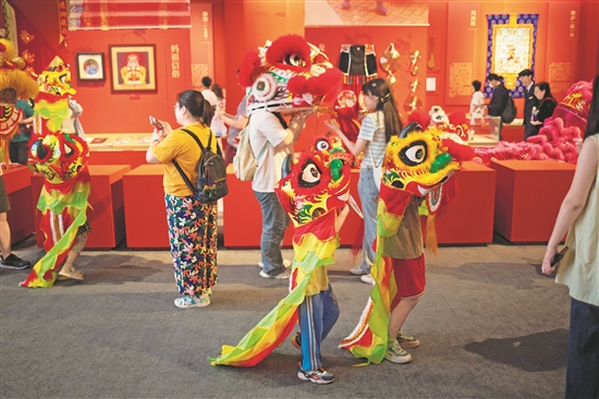 6月29日,北京,中国工艺美术馆内,小观众正在体验舞狮表演。暑假临近,不少博物馆推出精品展,让孩子们感受非遗。本报记者 王伟伟 摄