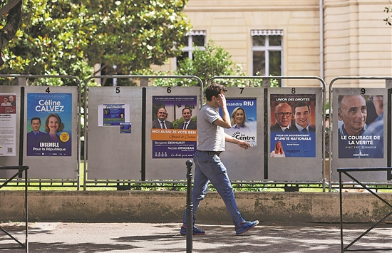 6月30日,在法国巴黎附近的克里希,一名男子走过街头的竞选海报。法国国民议会选举第一轮投票在当地时间6月30日8时开始,来自多个政党的4000多名候选人将角逐577个议席。新华社记者 高静 摄