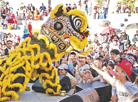 图为近日,在摩洛哥拉巴特哈桑二世公园剧场的“茶和天下·雅集”活动现场,小朋友和舞狮演员互动。新华社记者 霍晶 摄