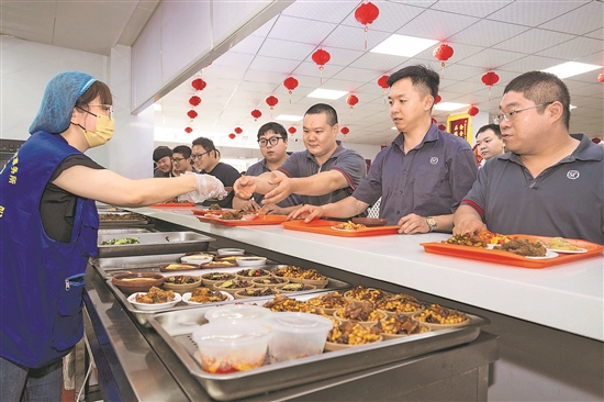 7月2日,在安徽合肥庐阳区海棠街道海棠花园小区社区食堂内,快递骑手正在就餐。当日,海棠街道党工委、总工会为辖区外卖、快递骑手发放社区食堂就餐券、理发卡等爱心礼包。本报通讯员 赵明 摄