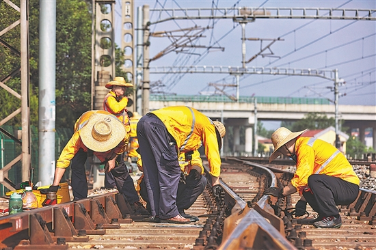 图为7月3日,徐州电务段夹河寨信号车间职工在进行设备巡检维护作业。许佳运 蒋杰 摄