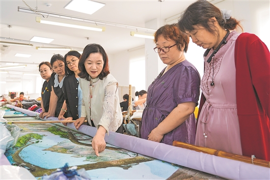 7月3日,国家级非遗项目(苏绣)代表性传承人姚建萍(右三)在工作室内与绣娘交流苏绣技艺。