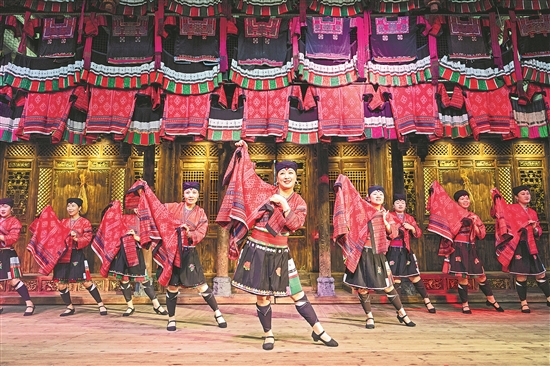 黄洛瑶寨村民演员在进行红瑶民俗文化表演(6月26日摄)。