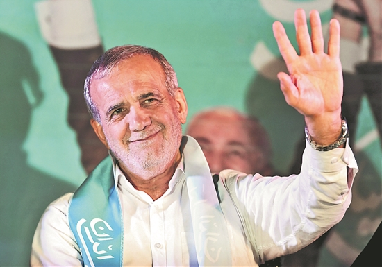 伊朗选举委员会此前宣布,前卫生部长佩泽什基安和前首席核谈判代表贾利利将在7月5日举行的总统选举第二轮投票中展开角逐。图为近日,在伊朗首都德黑兰,总统候选人、前卫生部长佩泽什基安参加竞选活动。新华社记者 沙达提 摄