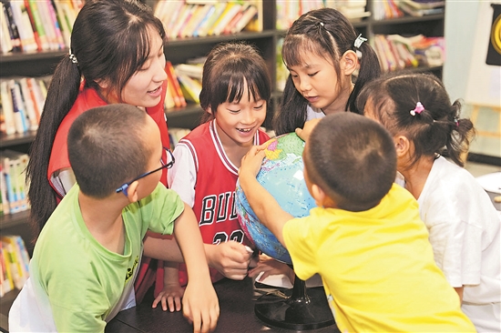 7月4日,在重庆市北碚区水土街道和悦家园社区,大学生志愿者在给小朋友介绍地理知识。暑期,水土街道和悦家园社区、北碚区和爱社会工作服务中心联合开展为期2个月的“社区带娃驿站”公益服务活动,招募大学生志愿者为临时辅导教师,为小朋友们提供托管照看服务,与孩子们一起开展文体游戏、手工制作等活动,丰富孩子们的暑假生活。