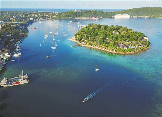 这是近日拍摄的瓦努阿图首都维拉港风光(无人机照片)。瓦努阿图位于太平洋西南部,由约80个岛屿组成,属于太平洋三大群岛之一的美拉尼西亚群岛。瓦努阿图属热带雨林气候,雨量充沛,丛林茂密,土地肥沃。