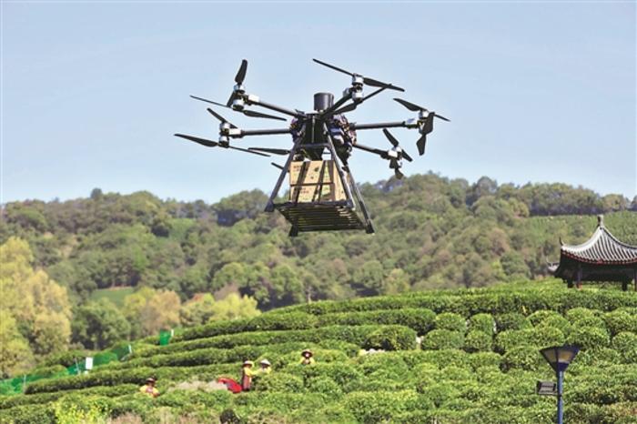 图为3月29日,在浙江省杭州市西湖区龙井村,顺丰无人机飞行在茶园上空运送春茶。本报记者 甘皙 本报通讯员 魏志阳 摄