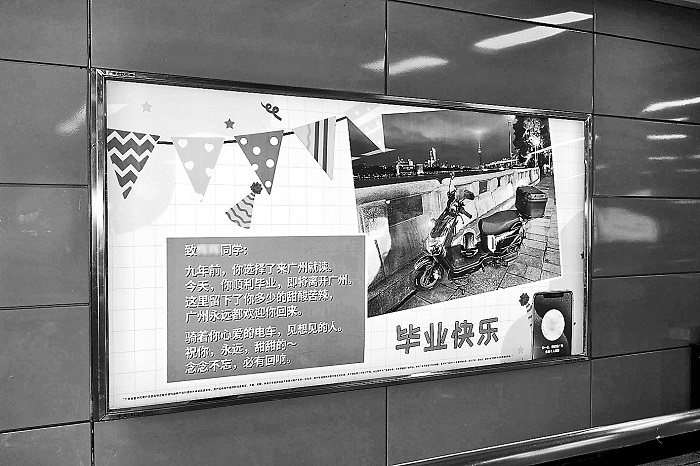 向瑶函是这则新闻的主人公,也是此后鼓励丁子明作出尝试的人。4月13日这天,在广州地铁珠江新城站B1出口,向瑶函的照片出现在一块醒目的广告屏幕上。“大家找工作和找对象都不容易”,广告屏上这句直白的话,配上他的简历和所获奖项,以及右下角的微信二维码,构成了一幅独特的画面。