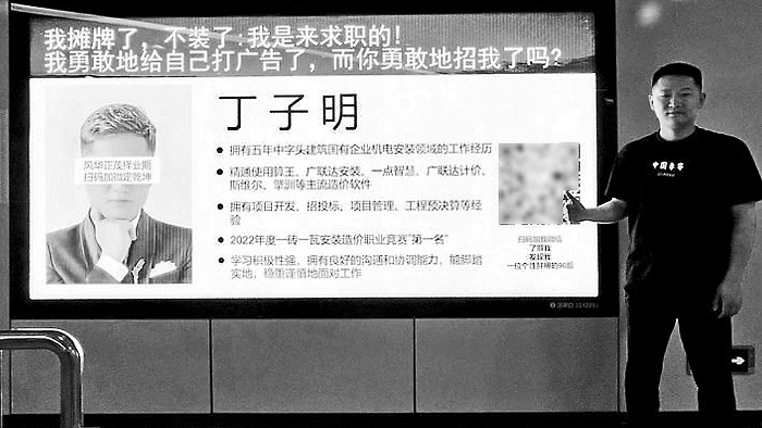 5月10日上午,正值上班早高峰,丁子明来到离家不远的一座地铁站,并不是为了通勤,而是要瞧瞧自己投放的个人广告牌,那也是一份特殊的求职简历。