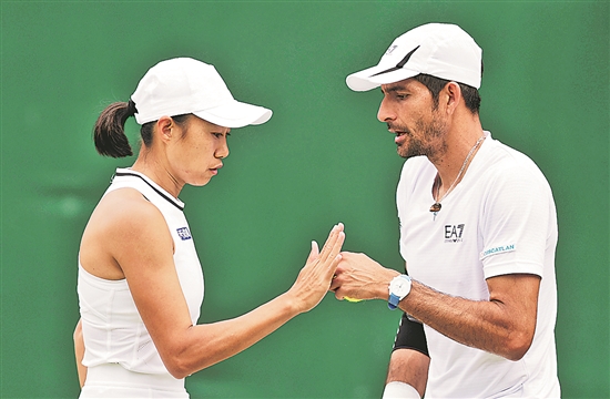 近日,在英国伦敦举行的2024温布尔登网球公开赛混合双打首轮比赛中,张帅(中国)/阿雷瓦洛(萨尔瓦多)组合1比2不敌美国组合沃雷涅茨/拉姆,止步首轮。图为张帅(左)/阿雷瓦洛在比赛中。新华社记者 韩岩 摄