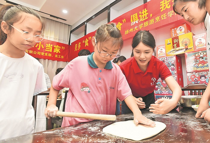当日,江苏省扬州市邗江区西湖街道经圩村党委和扬州大学旅游烹饪学院联合开展暑期公益培训实践活动。来自扬州大学的大学生志愿者们手把手教孩子们制作面点,让孩子们在学习生活技能中提高动手能力,体验劳动带来的快乐。