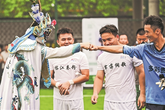 7月10日,川剧演员(左一)在比赛间隙和贵州榕江“村超”文旅队球员互动。