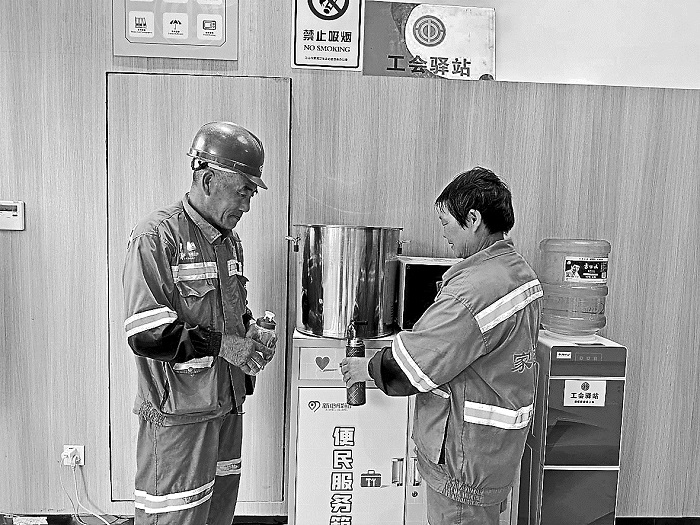 近日,浙江省江山市双塔街道党群服务中心为在酷暑中坚守岗位的环卫工人、外卖骑手等户外劳动者免费提供冰爽的绿豆汤、消暑茶,送上防暑用品“大礼包”,为高温下的一线劳动者送去关爱。近年来,双塔街道大力推进党群服务中心矩阵化建设,设置暖心关爱服务区,提供“爱心冰箱”、共享食堂等18项免费暖心关爱服务。本报通讯员 严力 摄