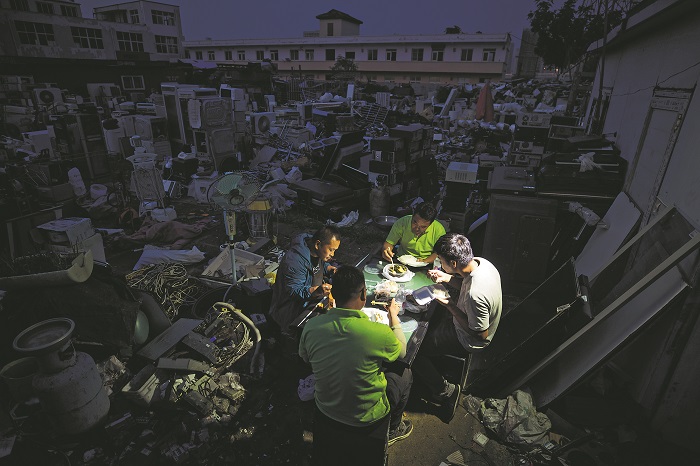 7月3日晚,忙碌了一天的家电回收员正在回收站的一处空地上吃晚饭。