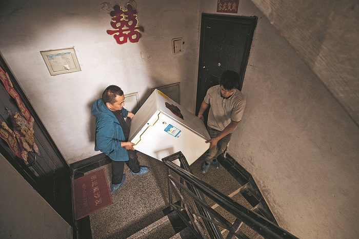 7月3日,家电回收员在一个老旧小区的单元楼内搬运旧冰柜。