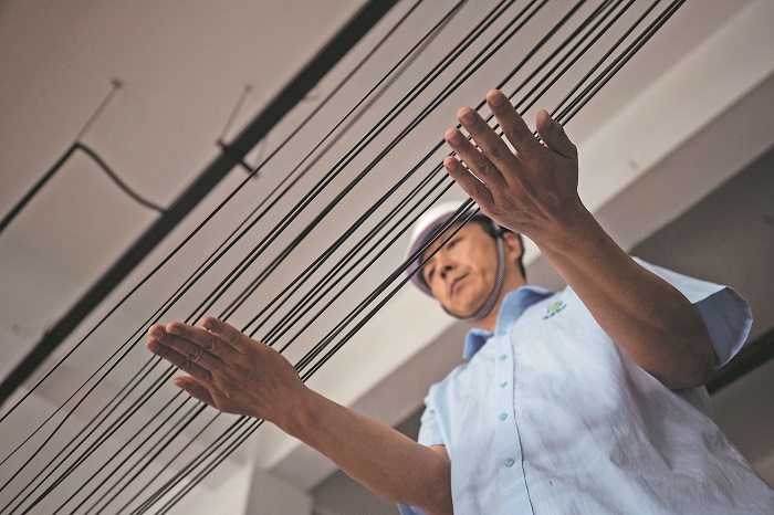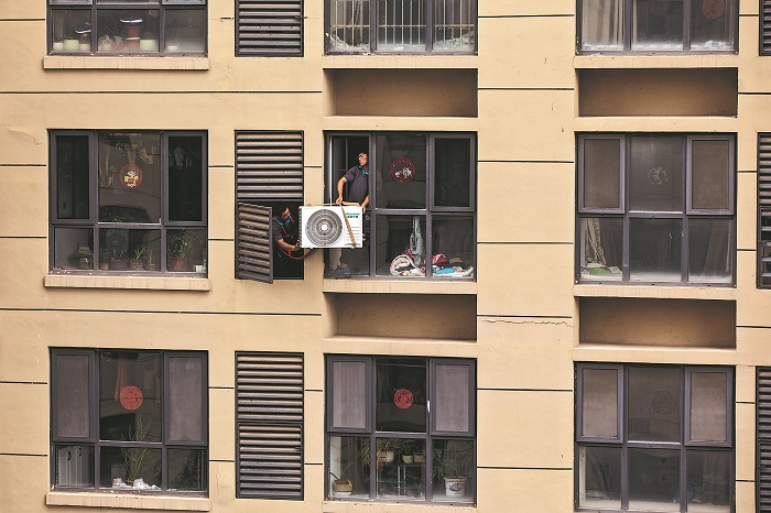 7月6日,空调安装工正在高层住宅楼上为客户安装空调。
