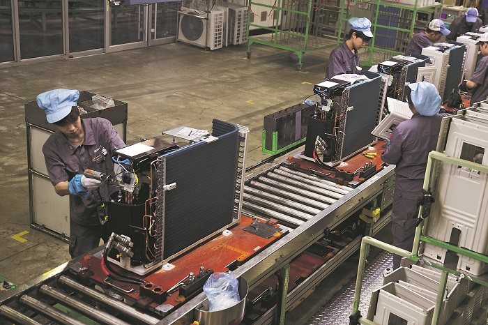 7月8日,一处空调生产车间内,工人正在流水线上组装空调。