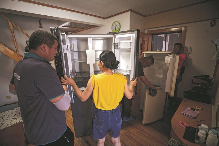 7月6日,一位市民(左二)在家里查看新购买的冰箱。她的旧冰箱也将被收走,最终被送往拆解工厂。