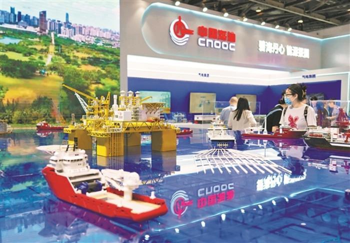 7月13日,参观者在北京科博会现场参观中国海油深水油气田勘探开发模型。