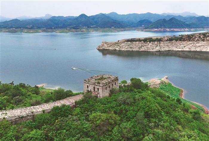7月13日,在河北承德宽城满族自治县境内的潘家口水库,游客乘船欣赏露出水面的长城。据介绍,这段长城是明长城,20世纪70年代因建设潘家口水库,部分长城隐没水下,从而形成“水下长城”奇观。新华社记者 杨世尧 摄