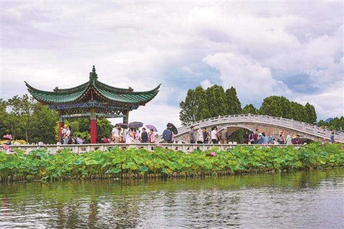 7月13日,游客在云南省昆明市大观公园内观赏荷花。盛夏时节,多地迎来旅游高峰期,游客纷至沓来,享受休闲度假的美好时光。 新华社发(郝亚鑫 摄)