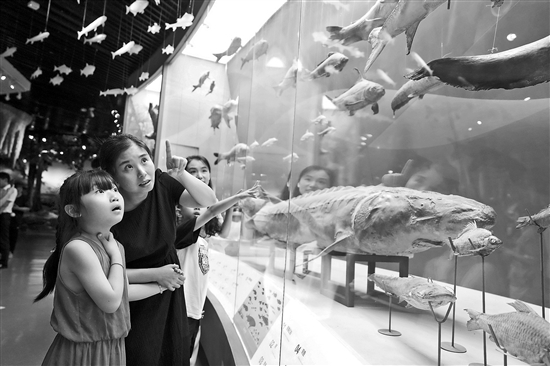 重庆市北碚区北温泉街道的“爱心妈妈”陪伴困境儿童在重庆自然博物馆参观(7月10日摄)。暑期,北碚区北温泉街道开展“爱心妈妈”伴童行公益活动,“爱心妈妈”带领困境儿童走进重庆自然博物馆,感受自然科学魅力,充实假期生活。新华社发(秦廷富 摄)